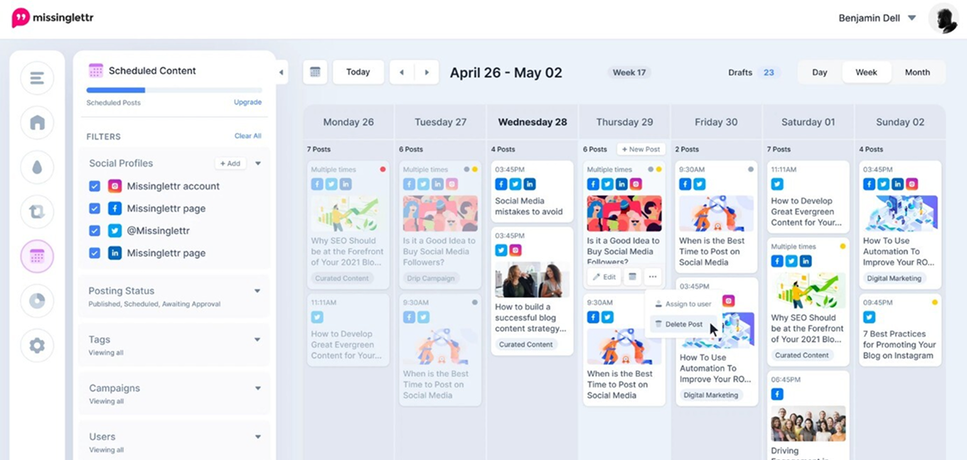 Missinglettr automatically turns your blog posts into year-long social media campaigns, making it ideal for bloggers and content marketers. It excels at converting blog posts into multiple social posts and managing content across platforms. It’s perfect for driving traffic back to your website. Missinglettr is better for blog automation, while RecurPost suits advanced content recycling across all post types on various social media platforms.
