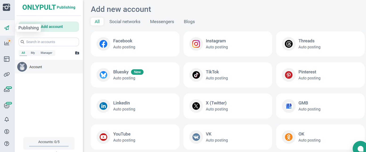 Instagram, Facebook, Linkedin, X, TikTok, Pinterest, Google Business, YouTube, VKontakte, Odnoklassniki, Telegram, Tumblr, WordPress, Medium, Threads, Bluesky