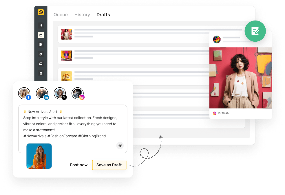 Collaborate with your team by sharing drafts, or work independently to perfect your posts. The “Save as Draft” feature integrates smoothly into your existing workflow.